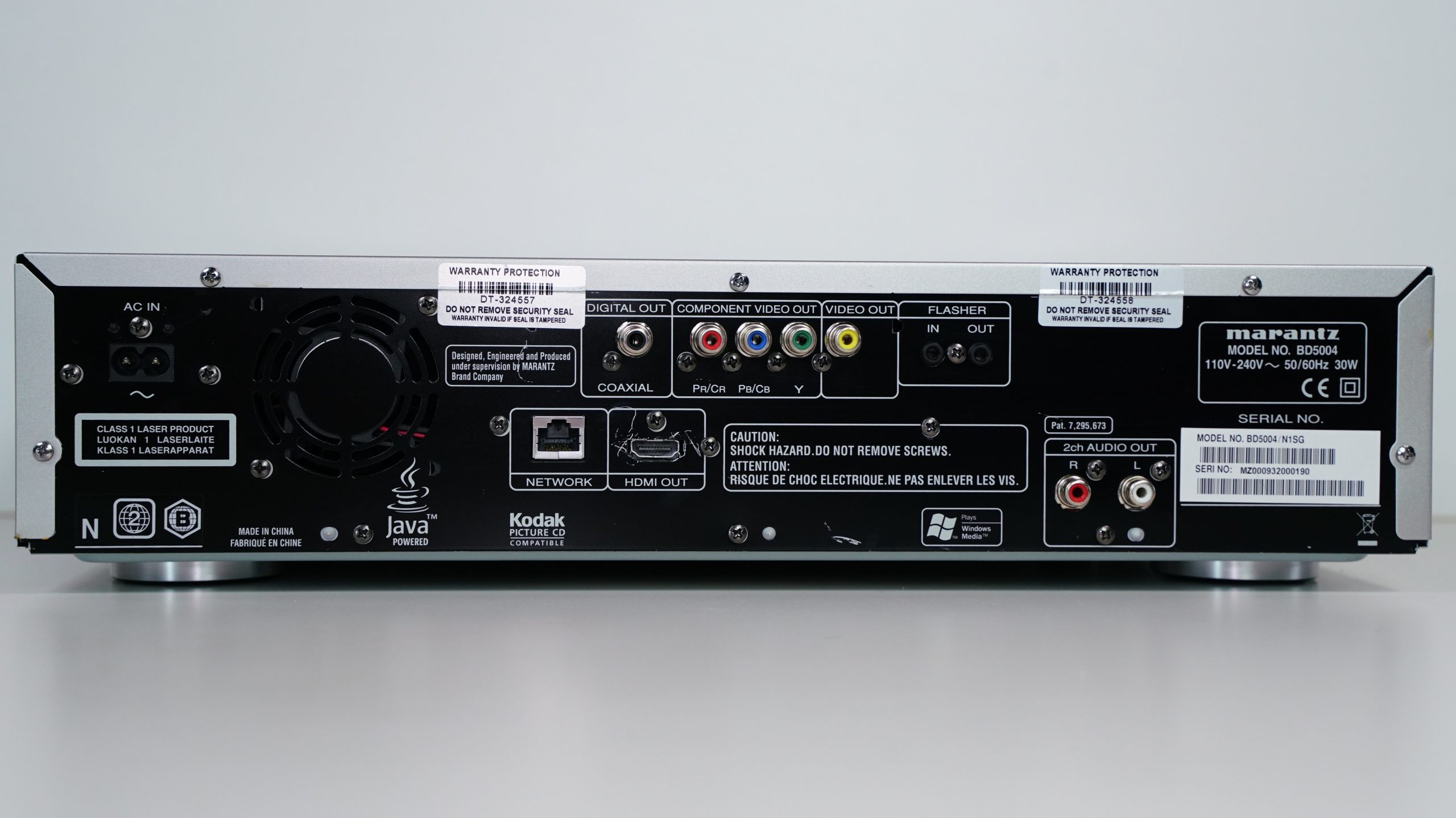 Tukee levyjä: BD-video BD-R BD-RE, CD, CD-R, CD-RW, DVD-V, DVD-R, DVD-RW. Tuetut tiedostomuodot: DivX-HD (CD/DVD), MP3 (CD/DVD), WMA (CD/DVD) Sisäänrakennetut dekooderit: Dolby Digital DTS BD-profiilit: 1.0 1.1 2.0 Yhteydet: HDMI 1.3a -komponenttikomposiitti analoginen stereo RCA digitaalinen koaksiaali Videon skaalaus: jopa 1080p PAL 60 -muunnos Progressiivinen skannaus (NTSC) Video-DA-muunnin: 150 MHz/12-bittinen Äänen DAC: 192 kHz/24-bittinen Äänen taajuusalue: 4–20 000 Hz Signaali-kohinasuhde: 115 dB Dynaaminen alue: 100 dB Harmoninen särö: 0,004 % (1 kHz) Nykyinen virrankulutus: 30W Mitat: 440 × 324 × 105 mm Paino: 4,3 kg.